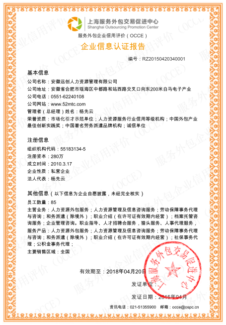 ◆2015年04月,遠(yuǎn)創(chuàng)人力連鎖通過首批服務(wù)外包企業(yè)信用評價體系(OCCE)信息認(rèn)證