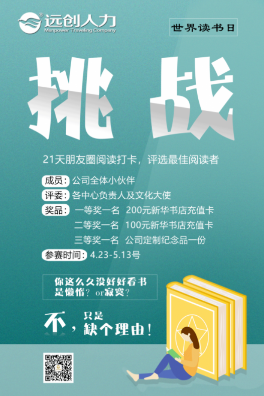 春和景明,時光恰好,正是閱讀好時節(jié)!正值第25個“世界讀書日”之際,為弘揚尊重知識和崇尚文明的閱讀理念,激發(fā)小伙伴們的閱讀熱情,享受讀書的樂趣,遠(yuǎn)創(chuàng)人力資源集團特開展“21天閱讀打卡活動”,希望小伙伴們養(yǎng)成多讀書、讀好書的習(xí)慣,在全公司營造崇尚讀書,重視讀書,堅持讀書的濃厚氛圍。
