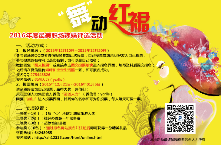 遠(yuǎn)創(chuàng)人力攜手“安徽我要遛遛網(wǎng)”、“中國社會(huì)保險(xiǎn)服務(wù)網(wǎng)”和“淘寶辦社保網(wǎng)官方店鋪”聯(lián)合舉辦2016年度最美職場辣媽評選活動(dòng),歡迎各位職場媽咪勇敢滴Po出照片(不限本人,可以推薦),曬美照、拼顏值,遠(yuǎn)創(chuàng)人力將根據(jù)大眾評審?fù)镀苯Y(jié)果對最終獲獎(jiǎng)的職場辣媽送出豐富好禮!