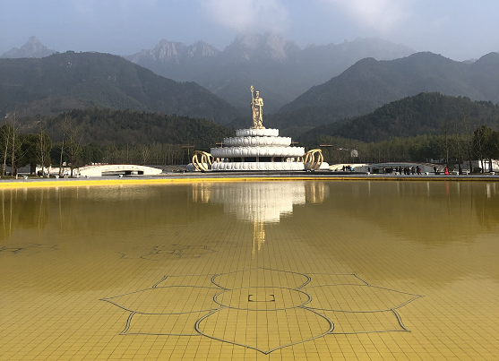 地藏菩薩露天銅像氣勢(shì)恢弘,高達(dá)九十九米,站在池邊可以清晰的看到漢白玉蓮花之上的地藏菩薩,在陽(yáng)光的照耀下,水底金黃色馬賽克的映托中,波光粼粼,金光閃閃,神奇壯觀。