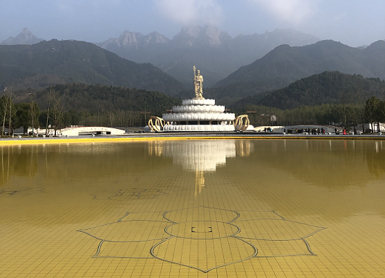 地藏菩薩露天銅像氣勢(shì)恢弘,高達(dá)九十九米,站在池邊可以清晰的看到漢白玉蓮花之上的地藏菩薩,在陽(yáng)光的照耀下,水底金黃色馬賽克的映托中,波光粼粼,金光閃閃,神奇壯觀。