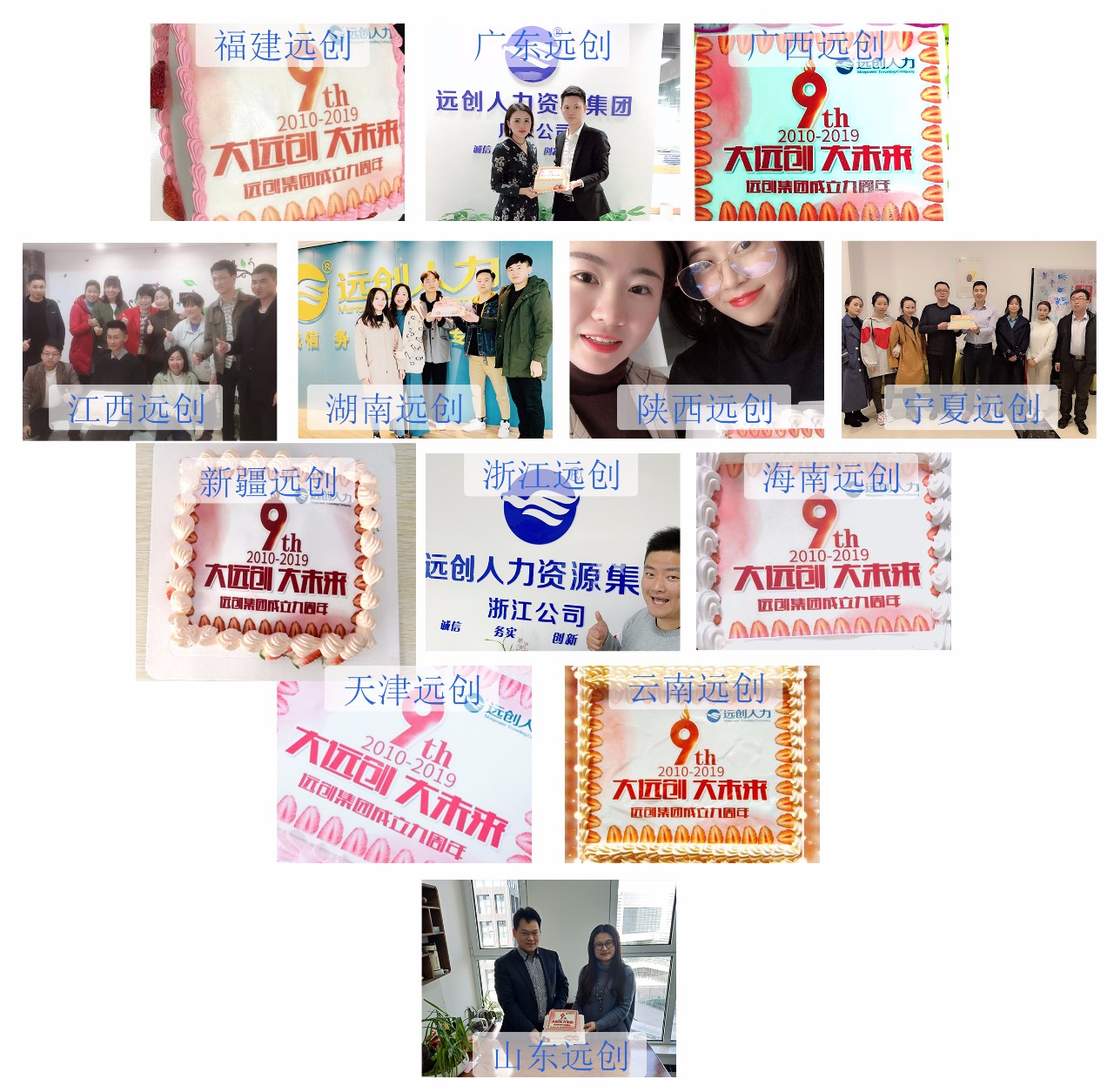 今天,遠創(chuàng)人力資源集團全國18個省級分支機構(gòu)的小伙伴們在上午10點59分共同為集團的九周年舉行了生日活動。