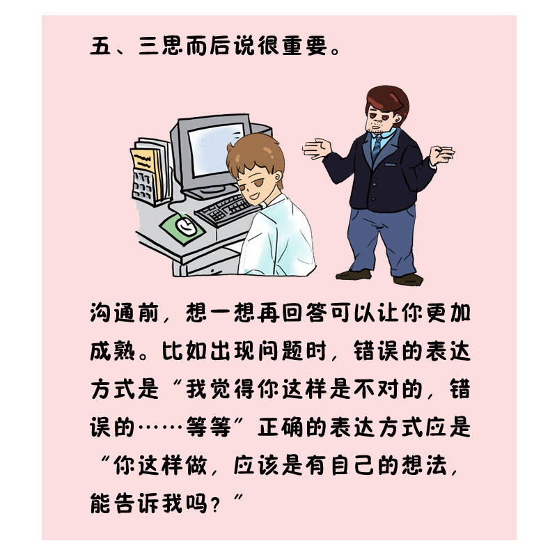 溝通前,想一想再回答可以讓你更加成熟。比如出現(xiàn)問題時,錯誤的表達方式是“我覺得你這樣是不對的,錯誤的……等等”正確的表達方式應(yīng)是“你這樣做,應(yīng)該是有自己的想法,能告訴我嗎?”