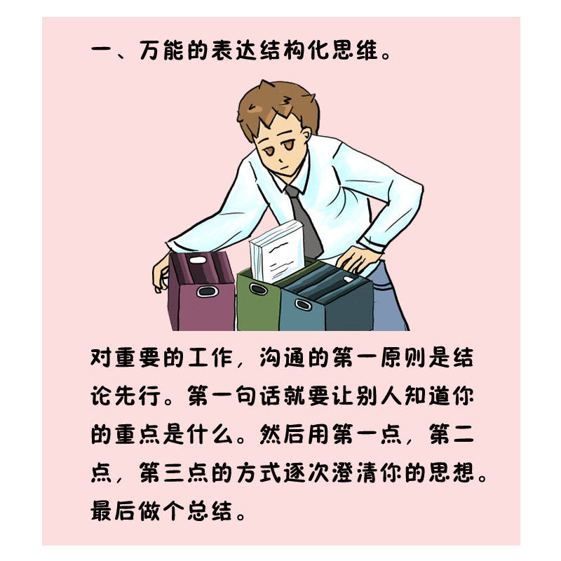 對重要的工作,溝通的第一原則是結(jié)論先行。第一句話就要讓別人知道你的重點是什么。然后用第一點,第二點,第三點的方式逐次澄清你的思想。最后做個總結(jié)。