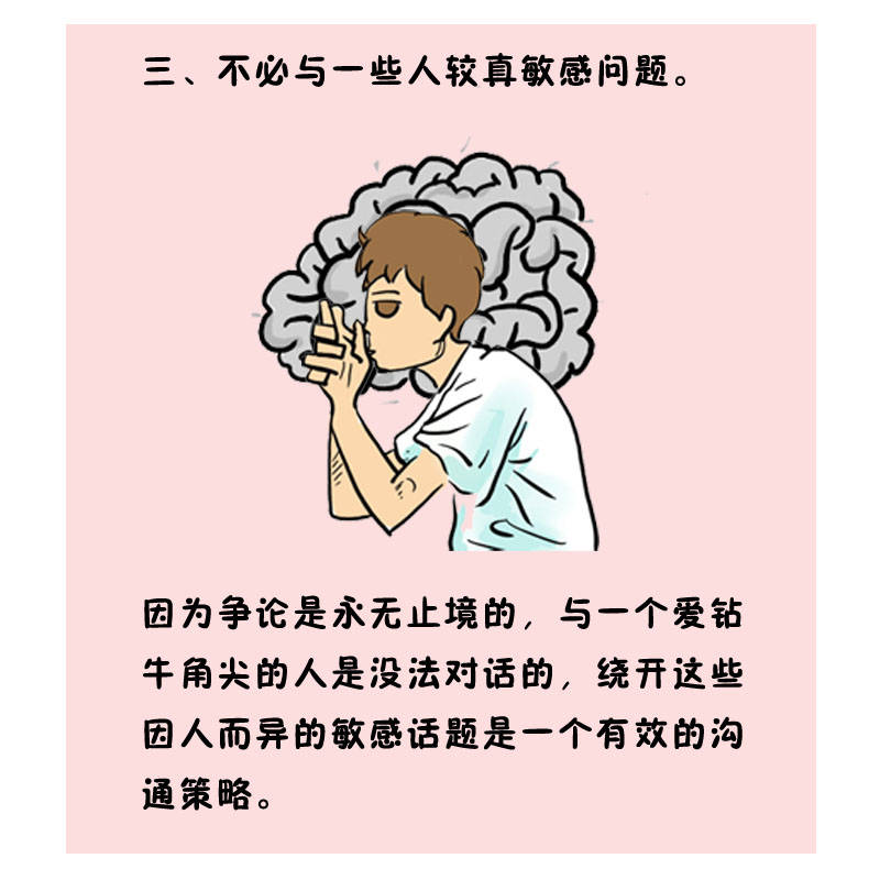 因為爭論是永無止境的,與一個愛鉆牛角尖的人是沒法對話的,繞開這些因人而異的敏感話題是一個有效的溝通策略。