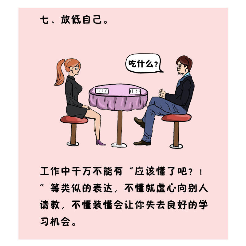 工作中千萬不能有“應(yīng)該懂了吧?!”等類似的表達,不懂就虛心向別人請教,不懂裝懂會讓你失去良好的學習機會。