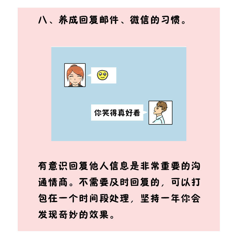 有意識回復他人信息是非常重要的溝通情商。不需要及時回復的,可以打包在一個時間段處理,堅持一年你會發(fā)現(xiàn)奇妙的效果。