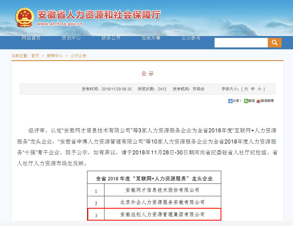 近日,安徽省人力資源和社會保障廳對外正式發(fā)布通報,確定3家人力資源服務(wù)企業(yè)為全省2018年度“互聯(lián)網(wǎng)+人力資源服務(wù)”龍頭企業(yè),安徽遠(yuǎn)創(chuàng)人力資源管理集團(tuán)有限公司名列其中。